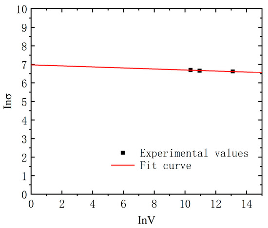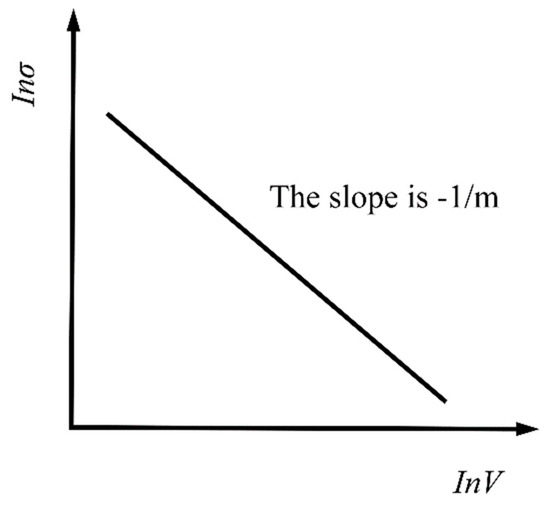 σ0 and m can be obtained by analyzing experimental data. For a material with a known volume, if its strength change can be described by Weibull distribution, the right end of Equation (4) can be drawn as a straight line, where m is the slope of the straight line and lnV is the intersection point of the straight line and the y-axis.