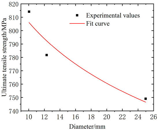 Figure 3. Power function fitting of ultimate tensile strength and diameter of specimen (using Formula (6)).