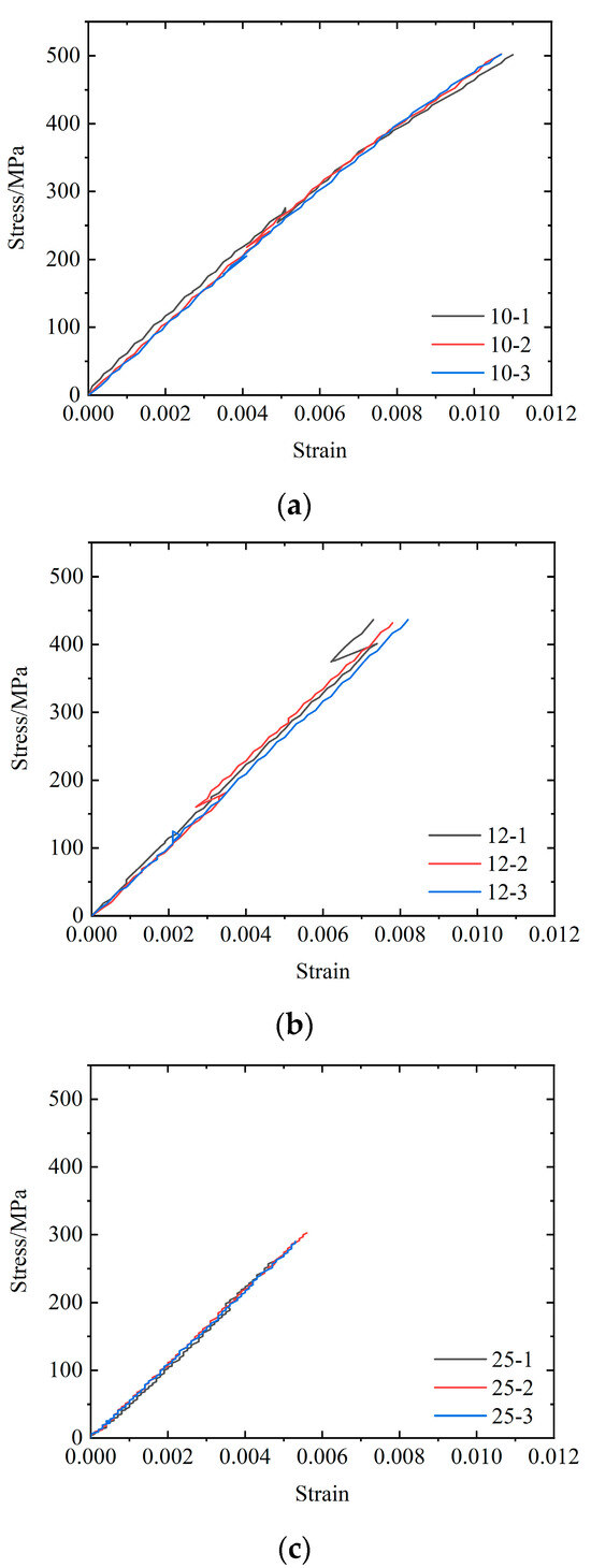 Figure 4. Stress–strain curves of GFRP tendons with different diameters. (a) Stress–strain curve of 10 mm diameter GFRP tendon. (b) Stress–strain curve of 12 mm diameter GFRP tendon. (c) Stress–strain curve of 25 mm diameter GFRP tendon.