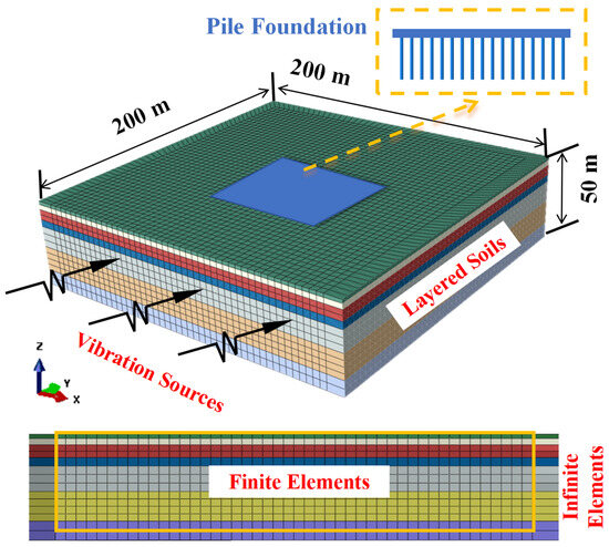 A three-dimensional finite element method (FEM) using ABAQUS 6.14 is employed to simulate the impact of field environmental microvibrations on the surface vibration response of foundation structures. As depicted in Figure 1, the established finite element model consists of two types of media: pile foundation and soil. The overall dimensions of the model are 200 m × 200 m × 50 m, with the foundation located in the middle area of the model’s surface, measuring 50 m × 50 m, aimed at investigating the vibration isolation effects of pile foundations under different conditions. The piles and pile caps are made of reinforced concrete with an elastic modulus of 30 GPa; circular cross-sections are chosen for the piles, modeled using line elements, while specific component parameters under different working conditions are detailed in the corresponding analysis sections. The dynamic characteristics of the foundation and soil are considered highly coupled. Therefore, treating pile–soil interactions as embedded zone constraints can effectively describe the contact behavior between the piles and soil. The soil and pile foundation are modeled using structured grid partitioning with C3D8 finite elements, with the bottom boundary of the foundation soil model fully fixed [31]. In dynamic analysis of infinitely large media such as foundations, a primary concern with artificial truncation boundaries is the reflection of waves at the interface of these boundaries, causing energy to be reflected back into the analysis domain instead of propagating to infinity. Therefore, CIN3D8 infinite element boundaries with sweeping grid division are employed at the three boundaries around the model and at the bottom boundary to effectively absorb vibration energy and prevent reflection errors in wave propagation [32,33]. To simulate the magnitude of environmental microvibrations around a high-precision laboratory under real-world conditions, the vibration input load is applied only at all nodes along one lateral boundary of the model, with the lateral boundary measuring 100 m × 50 m. This boundary is located at a horizontal distance of 75 m from the pile foundation.