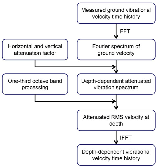 The initial step involves calculating the attenuated Fourier spectrum of Rayleigh waves at various frequencies and particular depths by employing the attenuation factor from the elastic semi-space method [17,41]. Subsequently, the second step involves one-third octave band processing, utilizing the number of sample points within each band to quantify the root mean square (RMS) velocity. Finally, an inverse Fourier transform is performed on all sample points to obtain the time-domain vibration velocity at the specified depth, post-attenuation, which serves as the vibration loading for the model.