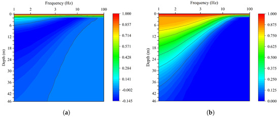 Figure 3 illustrates the spatial distribution of the horizontal and vertical attenuation factors for Rayleigh waves as a function of frequency and depth. It is evident that the horizontal attenuation factor initially exhibits a reverse increase, followed by a gradual decrease with depth. The vertical attenuation factor demonstrates amplification at a depth of approximately 15 m below the surface, followed by a subsequent decrease with increasing depth. The relationship between displacement attenuation and depth is intricately tied to frequency: higher frequencies correspond to shorter wavelengths, resulting in faster attenuation and a shallower propagation range, while lower frequencies exhibit the opposite behavior.
