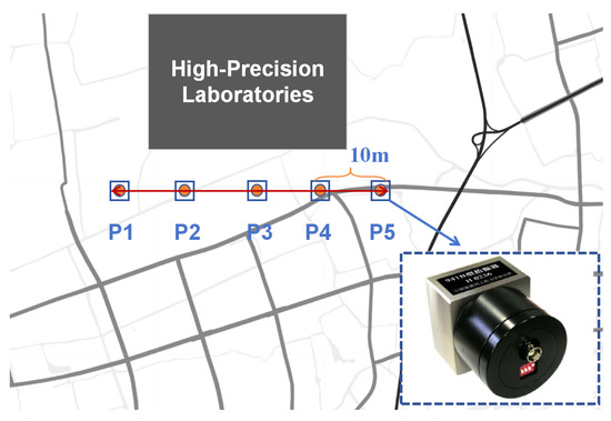 To validate the reliability and accuracy of the vibration simulation results, comparisons were made with on-site measurements and methods adopted in existing literature [42,43]. Figure 4 illustrates the setup of the on-site experimental tests conducted in the high-precision laboratory. Five measurement points (denoted as P1–P5) were arranged from left to right along one side of the laboratory to form a measurement line. The instrument employed for ground vibration measurements was the 941B velocity transducer supplied by the Institute of Engineering Mechanics of the China Earthquake Administration (IEMCEA). The velocity signal was amplified using a 941B amplifier and then acquired with an NI 9220 data acquisition device manufactured by National Instruments at a sampling frequency of 256 Hz, which is suitable for the generally low frequencies of environmental microvibrations.
