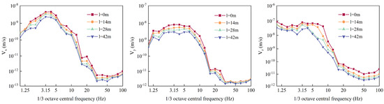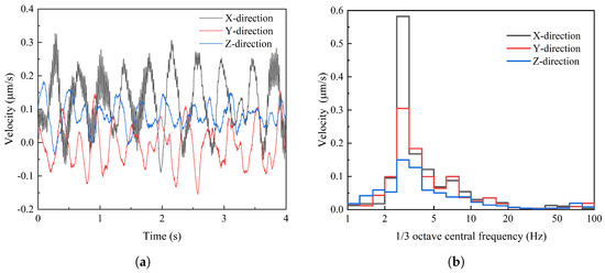An average value of these measurements was taken to represent the passive vibration velocity time history. The results of the one-third octave frequency analysis of these data are presented in Figure 5, where the X-axis, Y-axis, and Z-axis represent the east-west, north-south, and vertical directions, respectively. Compared to the vibration induced by the subway [12], the site microvibration frequency mainly concentrates in the low-frequency range of 0–10 Hz, with amplitudes significantly smaller than those induced by the subway, presenting a stable random fluctuation.