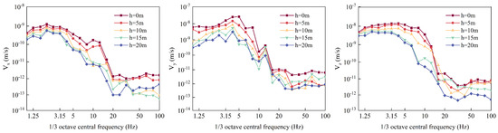 Figure 8 illustrates the spectral characteristics of vibration velocities at the foundation’s central baseplate surface along the X, Y, and Z directions, corresponding to the aforementioned burial depths. The analysis showcases marked disparities in vibration isolation properties at the central point of the pile foundation surface, inversely correlating the amplitude of velocity at the foundation’s surface center with increasing burial depth. This trend is primarily attributed to the augmented vibration isolation afforded by deeper foundations from surface-level disturbances, including traffic and industrial operations. An increment in burial depth enhances the soil’s damping properties, consequently curtailing the transmission of vibration energy.