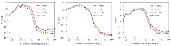 Figure 9 exhibits the velocity spectra at the center point of the pile foundation baseplate surface, analyzed through one-third octave band analysis, across these varying thickness scenarios in the X, Y, and Z directions. The findings demonstrate a significant reduction in vibration response at the central point with increasing baseplate thickness, affecting the entire frequency spectrum. Specifically, in the mid-to-high-frequency domain, increasing the thickness of the concrete baseplate significantly reduces the velocity vibration amplitude. However, in the low-frequency spectrum, adjustments in baseplate thickness appear to exert minimal impact on vibration attenuation at the foundation surface, possibly due to the pervasive nature of low-frequency vibrations.