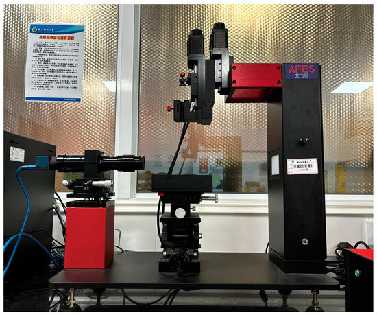 Optical contact angle apparatus (FCA2000A1, Shanghai, China) was utilized to assess the interfacial wetting properties between CEACB and RAP considering A/C ratios of 0.6, 1.0, and 1.4. During the measurements, CEACB was dropped onto the artificial RAP substrate using syringes, and the contact angle was recorded every two seconds over a 50 s duration. The optical contact angle apparatus is shown in Figure 2.