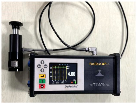 The assessment of the interfacial bonding strength between the CEACB and RAP was conducted using the binder bond strength (BBS) test, commonly referred to as the drawing test. The BBS test was conducted using automatic equipment (Posi Test AT-A, DeFelsko, West Chester, PA, USA), as illustrated in Figure 3.