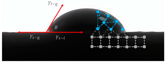 where represents the change in surface free energy at the liquid–solid interface, represents the solid–liquid surface free energy, represents the liquid–gas surface free energy, and represents the solid–gas surface free energy. The intuitive distribution of variables is shown in Figure 6.
