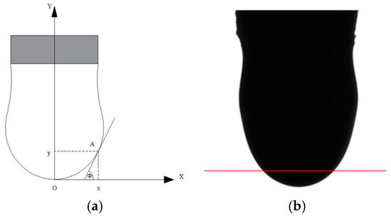 where represents the pressure differential between inside and outside the droplet at vertex , represents the pressure difference inside and outside the droplet at point A, and is the acceleration of gravity, taken as 9.8 m/s2; assuming that the droplet contour is symmetric about the Y-axis, the curvature at vertex is isotropic. By combining Equation (4) and analyzing the curvature of point A (, ) geometrically, the following Equation (5) can be obtained: