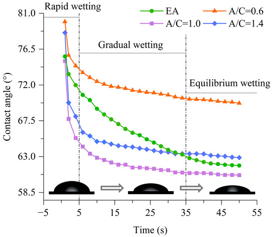 The results indicate that the addition of cement significantly affects the initial wettability of CEACBs, showing distinct phase characteristics compared to emulsified asphalt. For CEACBs, during the initial wetting stage, the incorporation of cement reduces their surface tension, leading to a notable decrease in the contact angle and facilitating rapid wetting and diffusion. As the duration of wetting increases, the change in contact angle gradually decreases, indicating a trend toward stability in the interaction between cement and emulsified asphalt. Eventually, with continuous wetting, the contact angle progressively decreases until it reaches an equilibrium state resembling Young’s contact angle. The overall impact on the wettability of CEACB is influenced by various factors, such as cement hydration heat release, the generation of hydration products, and the interaction between cement and asphalt.