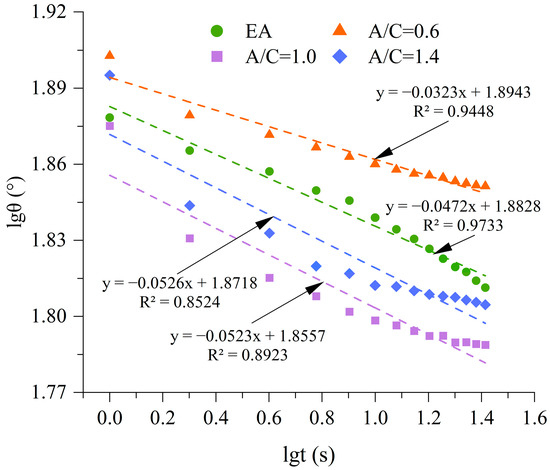 To further evaluate the influence of cement content on the dynamic wettability of CEACB on the aged asphalt film surface, logarithmic transformation was applied to three sets of CEACB contact angles, followed by function fitting. The fitting results are presented in Figure 9 using the linear function form , where parameter ‘’ signifies the initial contact angle of CEACB on the aged asphalt surface, and parameter ‘’ reflects the rate of change in the contact angle [21]. The absolute value of ‘’ is used to represent the diffusion coefficient, with a larger coefficient indicating a faster wetting speed. The correlation coefficient R2 was employed as an indicator to evaluate fitting quality, with values closer to 1 signifying higher accuracy in fitting. All three sets of fitted functions exhibit a correlation coefficient exceeding 0.85, showcasing the model’s capability to precisely assess the rate at which CEACB’s contact angle varies during wettability on the aged asphalt surfaces.