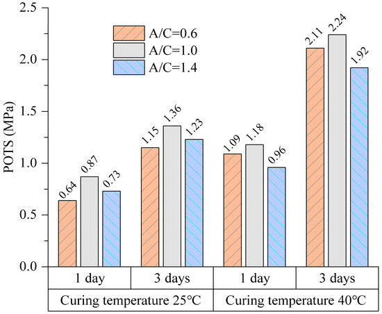 It is noteworthy that the analysis of the growth rate of POTS concerning time and temperature reveals that, at a curing temperature of 25 °C, extending the curing time from 1 day to 3 days results in a modest increase of approximately 0.5 MPa in strength. However, at a higher curing temperature of 40 °C, the strength experiences a more significant gain of nearly 1 MPa over the same 1 to 3-day curing period. This substantiates that an optimal curing temperature significantly contributes to the formation of bonding strength. In instances of lower temperatures, extending the curing time becomes imperative to attain the desired strength. Conversely, higher temperatures reduce the required curing time, enabling the swift restoration of traffic access.