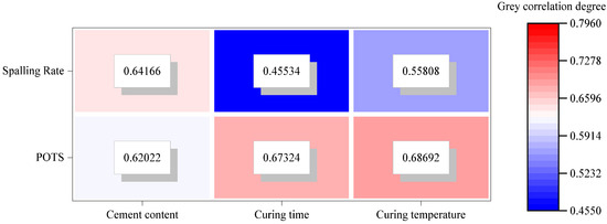 When utilizing the spalling rate as the reference sequence, the highest correlation is found with cement content, at 0.64166. The wettability of a CEACB is intricately affected by the cement content through modifications in the viscosity, flow properties, particle size distribution, and chemical interactions. The results demonstrate that favorable wettability increases the contact area between a CEACB and RAP, facilitating more effective infiltration of the CEACB into the RAP surface. Consequently, this enhances the interfacial adhesion between the CEACB and RAP, thereby reducing the possibility of spalling occurrence. However, there is a less pronounced association between curing time, curing temperature, and spalling rate, particularly noteworthy is the fact that the correlation degree between curing time and spalling rate is less than 0.5, which significantly deviates from correlations observed with the other influencing factors. These findings indicate that wettability primarily influences the spalling rate at the interface between a CEACB and RAP. Meanwhile, the establishment of bonding capacity between an CEACB and RAP surface is not yet fully formed, thereby limiting the influence of curing time on the spalling rate. Nevertheless, over time, the extent of CEACB curing intensifies, and the impact of curing time on the spalling rate becomes increasingly apparent, particularly during the later stages of curing.