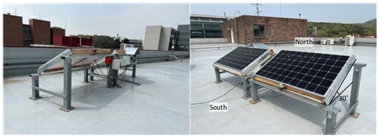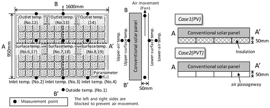 The experiments were conducted on the rooftop of Kyonggi University’s Lecture Hall No. 7 (latitude 37.30°, longitude 127.04°) in Yeongtong-gu, Suwon, Gyeonggi-do, Republic of Korea [22]. We examined the system performance improvement by reducing the temperature of the solar panel by passing air under the panel of an existing PV system and the collection efficiency through the increased temperature of the passing air. A conceptual diagram of the target panels used in this experiment is shown in Figure 1, and the actual installation is shown in Figure 2. The PV panels (Case 1) had insulation attached to the bottom of the typical panel, and the PVT (Case 2) panels had a space for air movement at the bottom of the panel. A fan was used to induce airflow. Both panels had the same output of 300 W. Both panels were installed at a 30° angle facing due south. In reality, the surface temperature of the panels varies due to external wind speeds. However, this study did not account for temperature changes caused by wind speed, as experiments comparing PV and PVT systems under identical conditions were conducted.