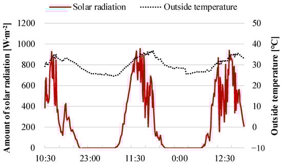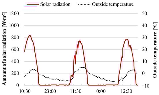 Figure 3 and Figure 4 show graphs comparing the solar radiation and outside temperature reaching the panels by season. The amounts of solar radiation reaching the panel surface in the summer were 3350 Wh, 5617 Wh, and 4020 Wh on the three days, as shown in Figure 3, with an average of about 4329 Wh, and the outside temperature was measured as having a low of 24.7 °C and a high of 37.0 °C. The amounts of insolation reaching the panel surface for the three days in the winter were 5518 Wh, 4821 Wh, and 4139 Wh, respectively, as shown in Figure 4, and the average was about 4826 Wh. The outside temperature was measured as a low of −7.6 °C and a high of 15.0 °C. Although solar radiation is generally considered higher in the summer, this experiment showed that more solar radiation reached the panel surface in the winter because the installation angle of the panel was fixed at 30°. The south-central altitude in the summer is 76° on average, while that in the winter is 29° on average. Thus, the amount of solar radiation perpendicular to the panel surface was higher in the winter, but the sunlight hours in the winter were shorter than those in the summer, limiting the amount of solar radiation.