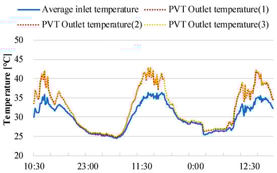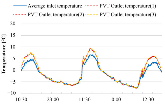 Figure 5 shows the average value of the inlet temperature of the PVT panel in the summer and the outlet temperature of the PVT panel at three points, and Figure 6 shows the inlet and outlet temperatures of the panel in the winter. Regardless of the season, the air temperature passing through the PVT panel increased through heat exchange with the panel, and the air heated by solar radiation increased by a maximum of 7.8 °C and an average of 3.6 °C in the summer, as shown in Figure 5, and a maximum of 3.3 °C and an average of 1.8 °C in the winter, as shown in Figure 6. To determine whether the increase in air temperature was caused by the difference in outside temperature or the difference in seasonal insolation, the correlation between insolation and the PVT outlet temperature was analyzed.