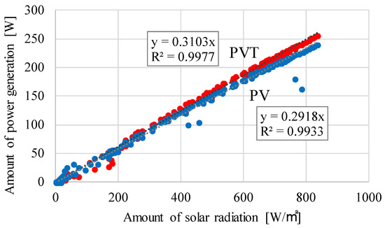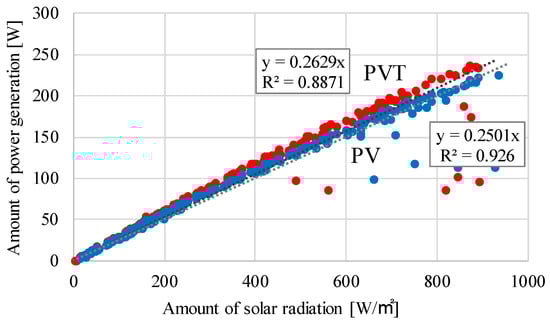 As in the previous analysis, we correlated the solar insolation with the panel power generation by season to check whether the observed results were a result of the correlation with solar insolation. Figure 7 and Figure 8 show the correlations of panel power generation with summer and winter insolation. The PVT system showed an approximately 4.9% and 6.3% improvements in power generation compared to that of the PV system in the summer and winter, respectively.