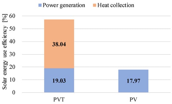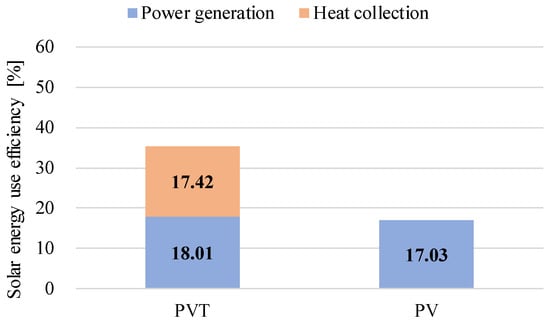 As shown in Figure 9, the PV system had a solar energy utilization efficiency of 17.97% in the summer, but the PVT system had a 5.89% performance improvement in terms of panel area power generation and an additional 38.0% solar collection efficiency, resulting in a total solar energy utilization efficiency of 57.07%. In addition, in the winter, as shown in Figure 10, the PV system showed a solar energy utilization efficiency of 17.03%, but the PVT system showed a performance improvement of 1.96% in panel power generation and an additional improvement of 17.42% in solar collection efficiency, resulting in a total solar energy utilization efficiency of 35.43%.