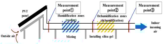Figure 11 is a schematic of a PVT system undergoing mist cooling and dehumidification. ① to ③ represent the measurement points in the duct through which the air passes. The instrument at ① measures the temperature and humidity of the air that passes through the PVT panel, that at ② measures the temperature and humidity of the air that passes through the mist humidification section, and that at ③ measures the temperature and humidity of the air that passes through the dehumidification process using a desiccant. The purpose of mist cooling and dehumidification using the air passing through the PVT system is to realize air conditioning in the summer when the outside temperature is high. Fans and ducts were installed to induce airflow (there was an average wind speed of 9.25 m/s and an airflow rate of 3.53 m3/min in the ducts), and temperature and humidity sensors were installed at the measurement points to obtain data in the form of a CSV file using an app that allows real-time monitoring. In addition, the dehumidification section used silica gel, and the dehumidifier was placed in a certain section of the duct to reduce the humidity of the air humidified through the mist. The amount of silica gel was divided into two parts, one that was 1 kg and the other that was 2 kg, to check the effect of the amount of desiccant on the temperature and humidity after the dehumidification process.