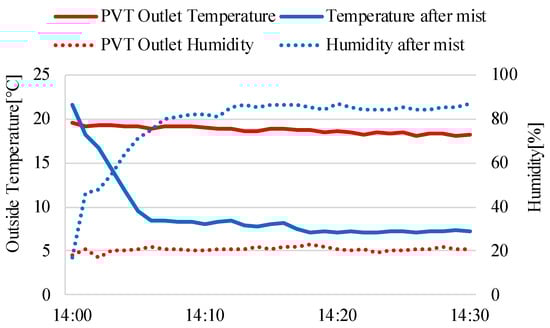 The experiment was conducted at 2:00 p.m., when the outside air temperature was at its highest, with 30 min of misting and dehumidification and a total of three measurements were taken. Figure 12 shows the average temperature and humidity changes during the mist humidification of the PVT outlet air between the three measurements. Before the mist cooling, the PVT outlet temperature was as high as 19.5 °C and as low as 18.1 °C. After the mist cooling, the air temperature decreased by 12.3 °C to 7.2 °C. The humidity increased by 65%, reaching a maximum of 83% RH.