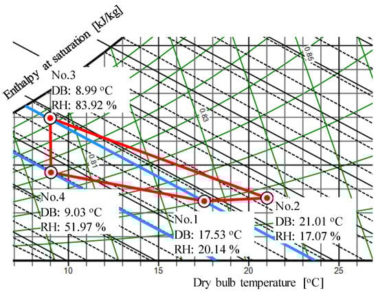 Figure 13 shows the change in the state of the air through the experimental process on a moisture airflow diagram. The air is shown in four different states: 1 is the outside air before entering the PVT system, 2 is the air that has been simply heated in passing through the PVT, 3 is the air that has been cooled and humidified by the mist, and 4 is the air that has been dehumidified by the desiccant. The air in state 1, which was the same temperature as that of the outside air, had a temperature of 17.53 °C and a humidity of 20.14% with an enthalpy of 24.04 kJ/kg. The air in state 1 passed through the PVT system and underwent a simple heating process. After this process, the air in state 2 was at 21.01 °C and 17.07% humidity, with an enthalpy of 27.79 kJ/kg, which was a 15.6% increase in enthalpy compared to that of the air in state 1. Next, the heated air in state 2 was humidified and cooled by mist cooling, which is shown in the upper left corner of the wet air line diagram. After the humidification cooling process, the air reached state 3, at which point the temperature decreased to 8.99 °C, and the humidity increased to 83.92%. The enthalpy was 24.07 kJ/kg, showing a slight decrease compared to that of the air in state 2. Finally, the humidified air was subject to dehumidification to remove excess moisture and reached state 4. The temperature of the air in state 4 was 9.03 °C, which is the same as the air in state 3, and the humidity was 51.97%, which is about 32% less than the previous state. As a result, the temperature and humidity of the air undergoing the experimental process changed from state 1 to state 4, and the corresponding enthalpy decreased from 23.94 kJ/kg of enthalpy for state 1 to 18.38 kJ/kg of enthalpy for state 4, which is about 23.2%, as shown in the graph in Figure 13.