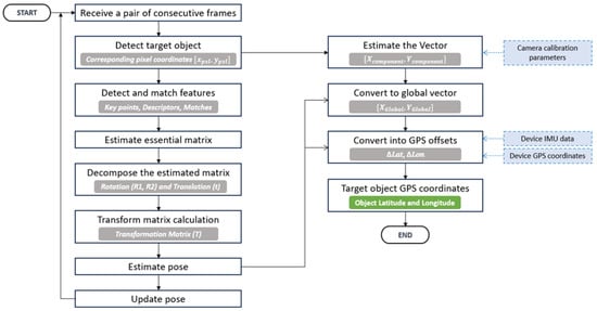| Parameters: N: Total number of iterations M: Number of frames to process within each iteration C: Set of parameters for camera initialization (frame width and height, horizontal and vertical FOV) G: Data structure for real-time GPS data I: Data structure for real-time IMU data |
