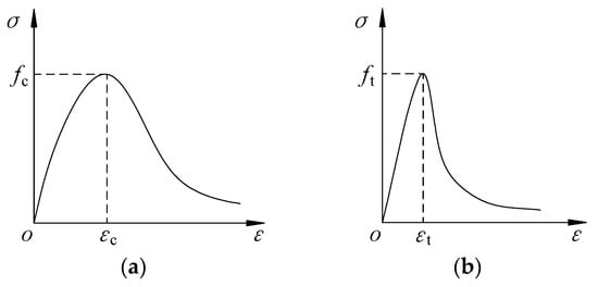 Uniaxial stress–strain curve of concrete []. (a) Uniaxial compression. (b) Uniaxial tension.
