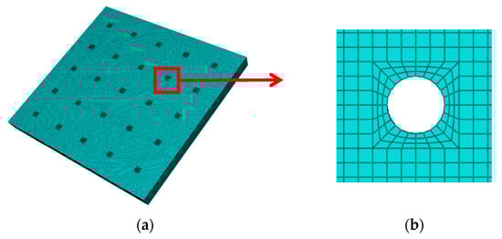 The constraints of the concrete slab were free on four sides, and the concrete model was divided into a finite element model consisting of hexahedral units with a mesh size of 10 mm using structural meshing techniques. The mesh size was more uniform by the way of separate seed distribution at the edge of the drilling hole. The mesh division of the whole concrete slab and the mesh division around the drilling hole is shown in Figure 2. The partition of the hexahedral element grid needs to ensure that every part of the whole structure is a hexahedron. For some complex structures, the automatic generation of a hexahedral element is relatively difficult. However, hexahedral mesh still has significant advantages compared with other types of mesh in finite element analysis, as it simultaneously considers all nodes and elements in the entire structure, ensuring the continuity and structural integrity of the mesh and helping to improve the stability and accuracy of numerical calculation. In addition, hexahedral meshes require fewer units while maintaining the same analytical accuracy, significantly reducing storage requirements. Concrete was simulated using an 8-node solid unit C3D8R.