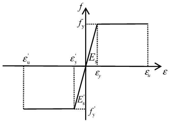 A double broken-line reinforced plastic model is used to describe the stress–strain response of steel. After the reinforcement enters the yield state, the stress–strain curve can be approximated as a straight line with a lower slope, which is conducive to the stability and convergence behavior of the calculation in the numerical simulation. The reinforced plastic model is shown in Figure 3, where εu is the ultimate strain of the reinforcement, εy is the yield strain of the reinforcement, fu is the ultimate strength of the reinforcement, and fy is the yield strength of the reinforcement. The specific constitutive equation can be seen in reference [].