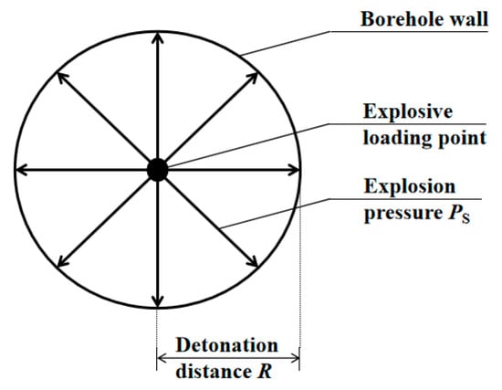 The CONWEP model can simulate the shock wave effect generated by an explosion, and its main advantage is that it considers the change law of a shock wave in terms of space and time dimensions, also integrating the formation, diffusion, and interaction with the structures of the shock wave []. Therefore, the CONWEP model can efficiently simulate the effect of an explosion on the structure without the need to establish a medium unit, which can significantly improve the computational efficiency [,]. In ABAQUS, the CONWEP model needs to be set in the interaction module, and the TNT equivalent and the distance from the explosion loading point to the action surface needs to be given during calculation so that the overpressure of the explosive acting on the structure can be calculated. In this paper, the loading point of the explosion is the center of the drilling hole, and the explosion distance R is the radius of the drilling hole. The loading diagram of CONWEP inside the drill hole in the reinforced concrete slab and the loading in ABAQUS is shown in Figure 4.