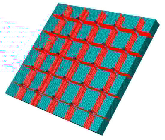 In ABAQUS, it is not necessary to separate the grid for the cohesive force unit, and the establishment of the cohesive force model requires the grid division of the concrete slab first, followed then by selecting a specified position in the concrete grid model according to the occurrence of cracks to insert the cohesive force model so as to simulate the crack development behavior of the concrete slab under stress. It can be seen from the test results of broken reinforced concrete slabs by a metal wire explosion in liquid that cracks mainly occur between drilling holes and between drilling holes and the edge of the slabs. The cohesive force unit is inserted according to the location of cracks in the test, as shown in Figure 5.