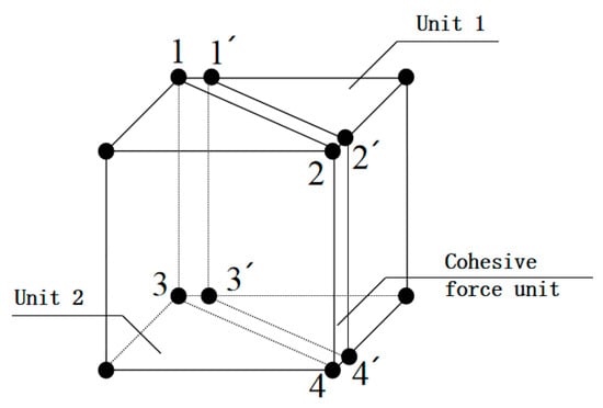 The cohesive force model in this paper uses a bilinear cohesive force constitutive relation, a maximum nominal stress criterion (MAXS) as damage initiation criterion, and an energy-based damage evolution process. The Cohesive force model in ABAQUS is based on COH3D8 (namely, a three-dimensional eight-node cohesive force unit). The cohesive force unit inserted between adjacent units is shown in Figure 6. In Figure 6, 1 and 1’, 2 and 2’, 3 and 3’, 4 and 4’ are adjacent cells, respectively. The unit is specially designed to simulate the damage and separation of the interface between materials, and it is often used to simulate the stratification and fracture behavior of materials, being able to effectively simulate the cracking process of concrete materials. The crack width can be obtained by measuring the spacing of adjacent cohesive force elements.