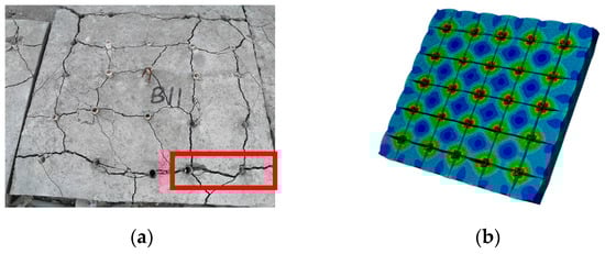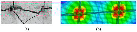 Taking slab B1 as an example, the comparison of the crushing effect between the test and simulation after the PPD of reinforced concrete slab is shown in Figure 7. Figure 8 shows the comparison between the test and simulation results of the cracks between the adjacent holes, and Figure 9 shows the comparison between the test and simulation results of the cracks between the holes and the edges of the slab. From Figure 7, Figure 8 and Figure 9, it can be seen that the fracture effect of simulation is basically the same as that of the test. The cracks between each adjacent borehole are all connected, and the cracks around the outermost borehole extend to the edge of the slab, while the whole reinforced concrete slab is divided into several small plates by cracks.