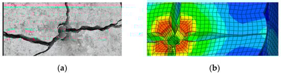 Comparison of experimental and simulated results of cracks between borehole and slab edge. (a) Test result. (b) Simulation result.