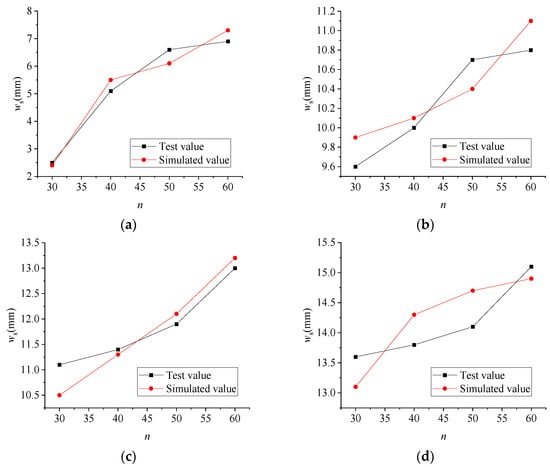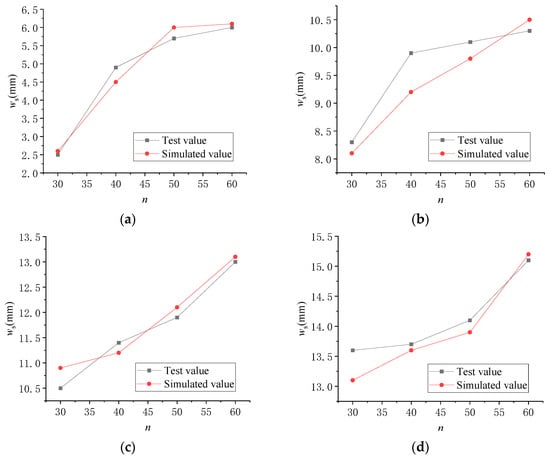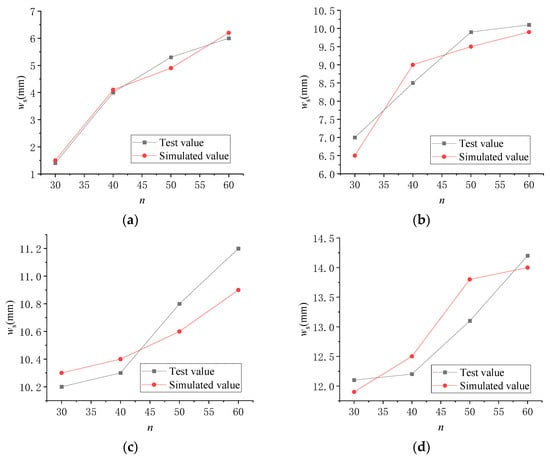 In order to verify the accuracy of the finite element analysis results, the test results of the crack width of a reinforced concrete slab under the same conditions were compared with the simulation results. The comparison of the crack width data under the strength of C20, C30, and C40 is shown in Figure 10, Figure 11, and Figure 12, respectively. The average value of the crack width ws data under the same number of copper wires n and the same voltage was taken. As can be seen from Figure 10, Figure 11 and Figure 12 simulation data and test data fit well, and the relative errors of the measured crack width and simulation analysis value are both within 10% under the same conditions.
