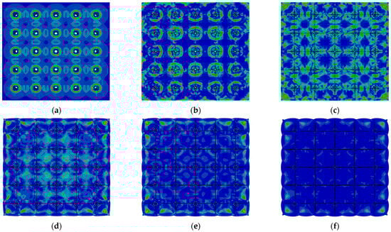The whole process of stress and crack expansion of reinforced concrete slab. (a) t = 60 µs; (b) t = 80 µs; (c) t = 130 µs; (d) t = 150 µs; (e) t = 170 µs; (f) t = 190 µs.