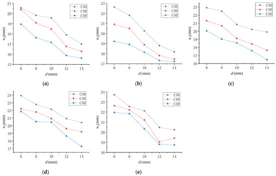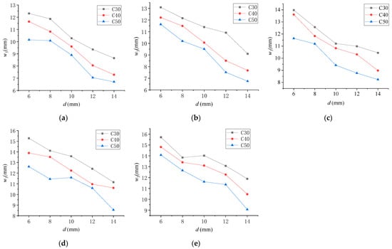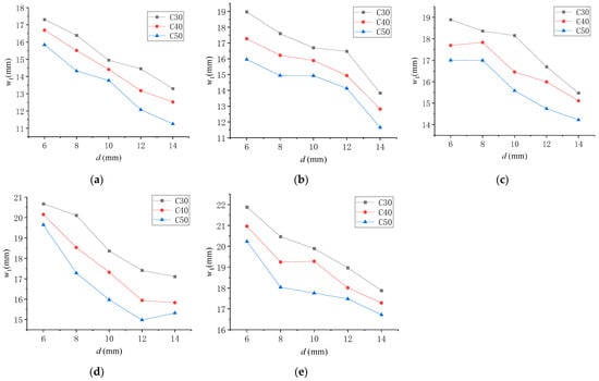 According to the simulation analysis results, the variation curve of edge crack width w1 with reinforcement diameter d under different reinforcement spacing is shown in Figure 14. As can be seen from Figure 14, when the concrete strength and the reinforcement spacing are the same, the edge crack width decreases with the increase in the reinforcement diameter. When the reinforcement diameter increases from 6 mm to 14 mm, the edge crack width of the C30 reinforced concrete slab decreases by 23.22%, 27.10%, 18.10%, 17.22%, and 18.28%, respectively, for the reinforcement spacing of 100 mm, 150 mm, 200 mm, 250 mm, and 300 mm. For C40 reinforced concrete slabs, the decrease was 24.99%, 25.77%, 14.58%, 21.44%, and 17.51%, respectively. For C50 reinforced concrete slabs, the decrease was 28.98%, 27.01%, 16.35%, 22.11%, and 17.35%, respectively.