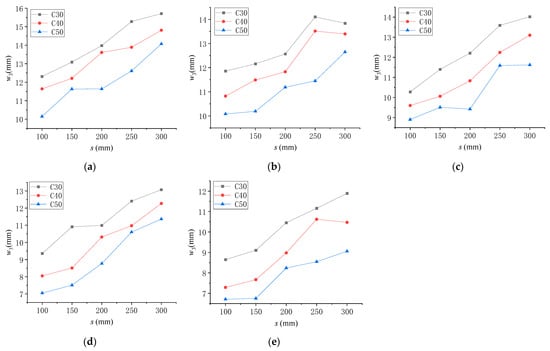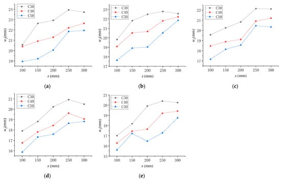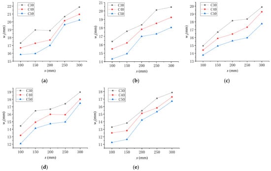 According to the simulation analysis results, the variation curve of edge crack width w1 with reinforcement spacing s under different reinforcement diameters is shown in Figure 17. As can be seen from Figure 17, when the strength of concrete is the same as the diameter of reinforcements, the widths of edge cracks increase with the increase in the spacing of reinforcements. When the reinforcement spacing increases from 100 mm to 300 mm, the edge crack widths of 6 mm, 8 mm, 10 mm, 12 mm, and 14 mm of C30 reinforced concrete slab increase by 23.22%, 27.10%, 18.10%, 17.22%, and 18.28%, respectively. For C40 reinforced concrete slabs, the increase is 24.99%, 25.77%, 14.58%, 21.44%, and 17.51%, respectively. For C50 reinforced concrete slabs, the increase is 28.98%, 27.01%, 16.35%, 22.11%, and 17.35%, respectively.