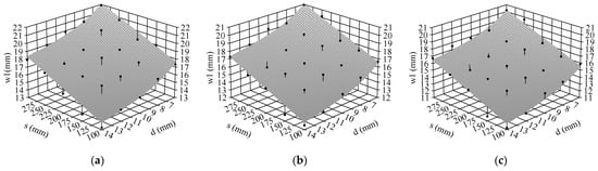 In order to facilitate an engineering application, based on the above simulation analysis results, the relationship between crack width at different positions of concrete slabs and reinforcement spacing s and reinforcement diameter d was analyzed. Taking edge cracks as an example, the 3D fitting surface is shown in Figure 20.