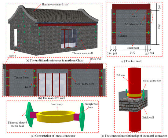 Taking the traditional residential timber frame–brick wall system as the research object, one group without metal connectors and three groups with different numbers of metal connectors placed at various positions in traditional residential wall models were established. Taking specimen MC-1 as an example, as shown in Figure 10.