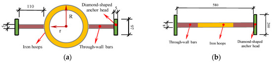 To enhance the out-of-plane collaborative performance of the timber frame and the wall, a metal connector was proposed and designed, primarily composed of a diamond-shaped anchor head, through-wall bars, and iron hoops (Figure 2d). The dimensions of the metal connector are illustrated in Figure 3, where “r” represents the column diameter of 330 mm, and “R” represents the outer diameter of the iron hoops of 360 mm. The positional relationship between the metal connector, the column, and the brick wall is depicted in Figure 2e, where the iron hoops are welded to the corresponding positions on the timber columns. Subsequently, the diamond-shaped anchor heads at both ends are connected by the through-wall bars, with the diamond-shaped anchor head ends tightly against the wall surface. The distribution of the metal connectors shows a gradually denser state from bottom to top. A 3D structural diagram of a typical traditional residence in northern China equipped with metal connectors is shown in Figure 2a. Traditional residences mainly consist of gable walls, timber frames, roofs, and rear eave walls. The connection between the columns and the walls is facilitated by the metal connectors for out-of-plane tension. The rear eave wall in Figure 2b is primarily composed of timber frames, brick walls, metal connectors, and doors. The corner columns deviate from the gable wall, with the gable wall and the door serving as boundaries, selecting both sides of the timber frame–brick wall system of the rear eave wall as the research object, the model dimensions are as shown in Figure 2c.