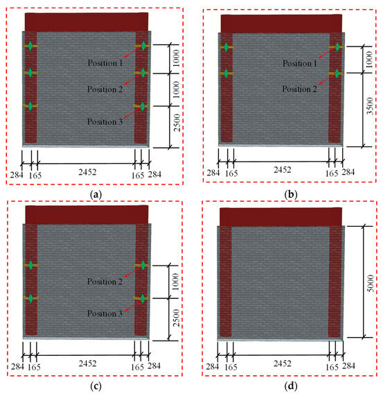 Based on different metal connector distributions, four sets of traditional residential wall models were designed: MC-1 had metal connectors at locations 1, 2, and 3; MC-2 had metal connectors at locations 1 and 2; MC-3 had metal connectors at locations 2 and 3; and MC-4 had no metal connectors, as can be seen in Figure 4. Location 3 was positioned 2500 mm above the base of the brick wall, with equidistant spacing of 1000 mm between each location.