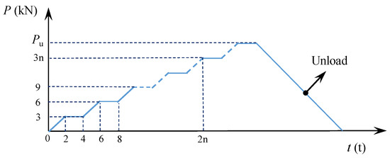 From reference [8], a uniformly distributed load was applied to simulate the out-of-plane mechanical behavior of the timber frame–wall system due to the inertial forces generated by the self-weight of the brick wall under seismic excitations. Load control was employed, with an increment of 1 kPa in the out-of-plane pressure applied at each level, equivalent to an increment of 3.0 kN in the out-of-plane load on the specimen. The load was sustained for 2 s after each level of loading until failure occurred in the out-of-plane direction of the brick wall, at which point the loading was stopped. The loading regime is illustrated in Figure 5.