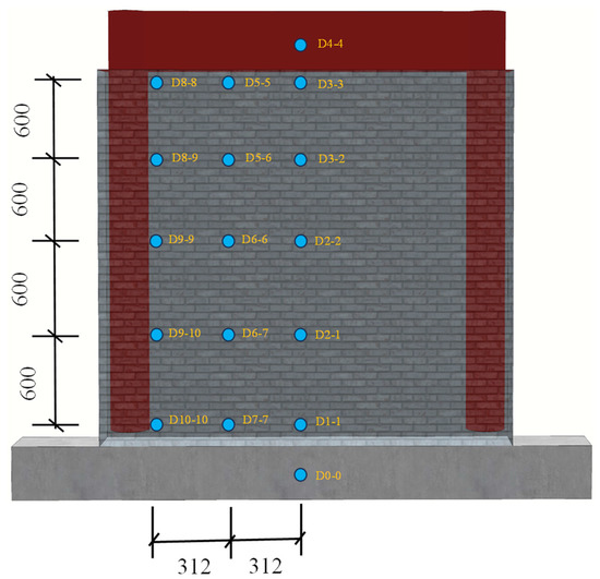 The displacement measurement points, as shown in Figure 6, were positioned at lateral intervals of 613 mm on the left half of the wall and vertical intervals of 1200 mm to capture the out-of-plane deformations at different locations of the brick wall.