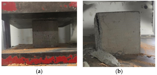 Normal cement mortar, composed of cement, sand, and water, was used to produce three standard mortar cube specimens with a side length of 70.7 mm [17]. Their mechanical properties were determined using an electronic universal testing machine, as illustrated in Figure 9. The compressive strength and failure load of the mortar are presented in Table 3.