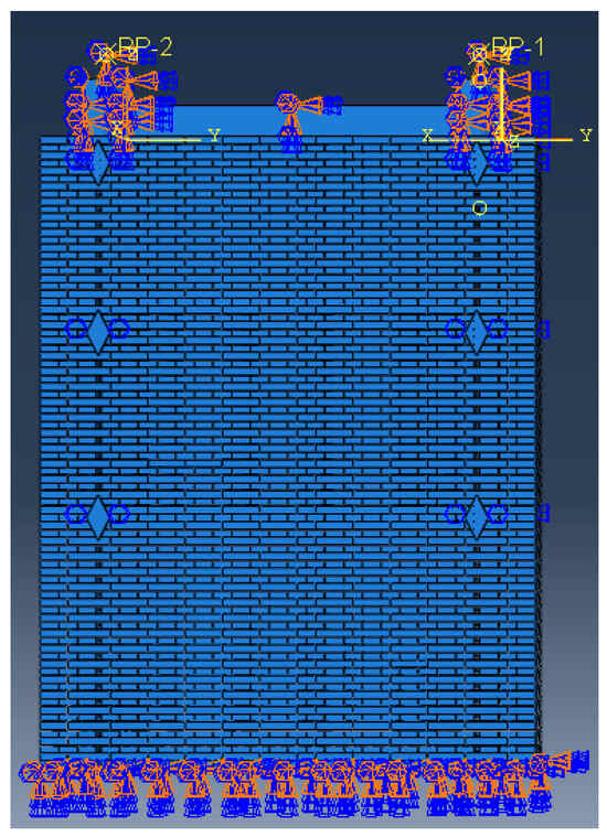 During the modeling process using the finite element software ABAQUS, the bottom of the wall and the column were fixed-constrained, while the top of the column was restrained through binding to reference points RP-4 and RP-2, respectively. The reference points were fixed-constrained (Figure 10), and a uniformly distributed load was applied to the wall surface inside the timber frame. Regarding the contact relationship, binding connections were used between the metal hoops and the columns, and the mechanical parameters of the contact between the composite masonry blocks were referenced from Table 5.