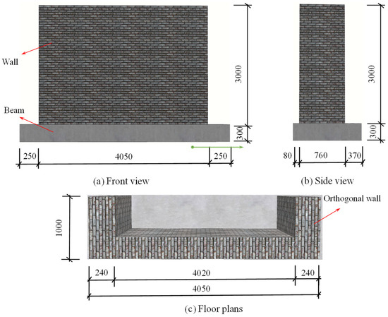 The experimental results from reference [23] were utilized to validate the damage criteria and surface contact behavior of the composite masonry blocks involved in the finite element model. The W3 specimen was selected for modeling to verify the rationality of the finite element model. The W3 specimen, representing a brick wall without floor loads and without metal connectors, is depicted in Figure 11.