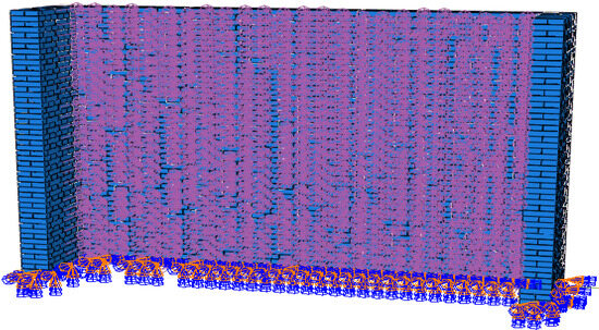 Using the finite element software ABAQUS, a wall model was established based on specimen W3, as shown in Figure 12. Fixed constraints were applied at the bottom of the wall and the column, while a uniform load was applied to the wall surface to simulate airbag loading. The specific contact details were as follows: the tangential contact mechanical parameters of the composite blocks were referenced from the material test measurements in [23], with tn0, ts0, and tt0 set to 230 kPa, 36.75 kPa, and 36.75 kPa, respectively. Normal contact was modeled as hard contact, with the composite block’s elastic modulus set to 800 MPa, its density set to 1700 kg/m3, and Poisson’s ratio set to 0.2.