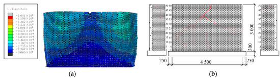 From Figure 13a, it can be observed that the failure mode of the wall in the finite element simulation is an inverted “Y” shape, which is consistent with the experimental failure mode. The out-of-plane ultimate loads of specimen W3 from the experiment and the finite element simulation are shown in Table 6, with an error of 2.5%.